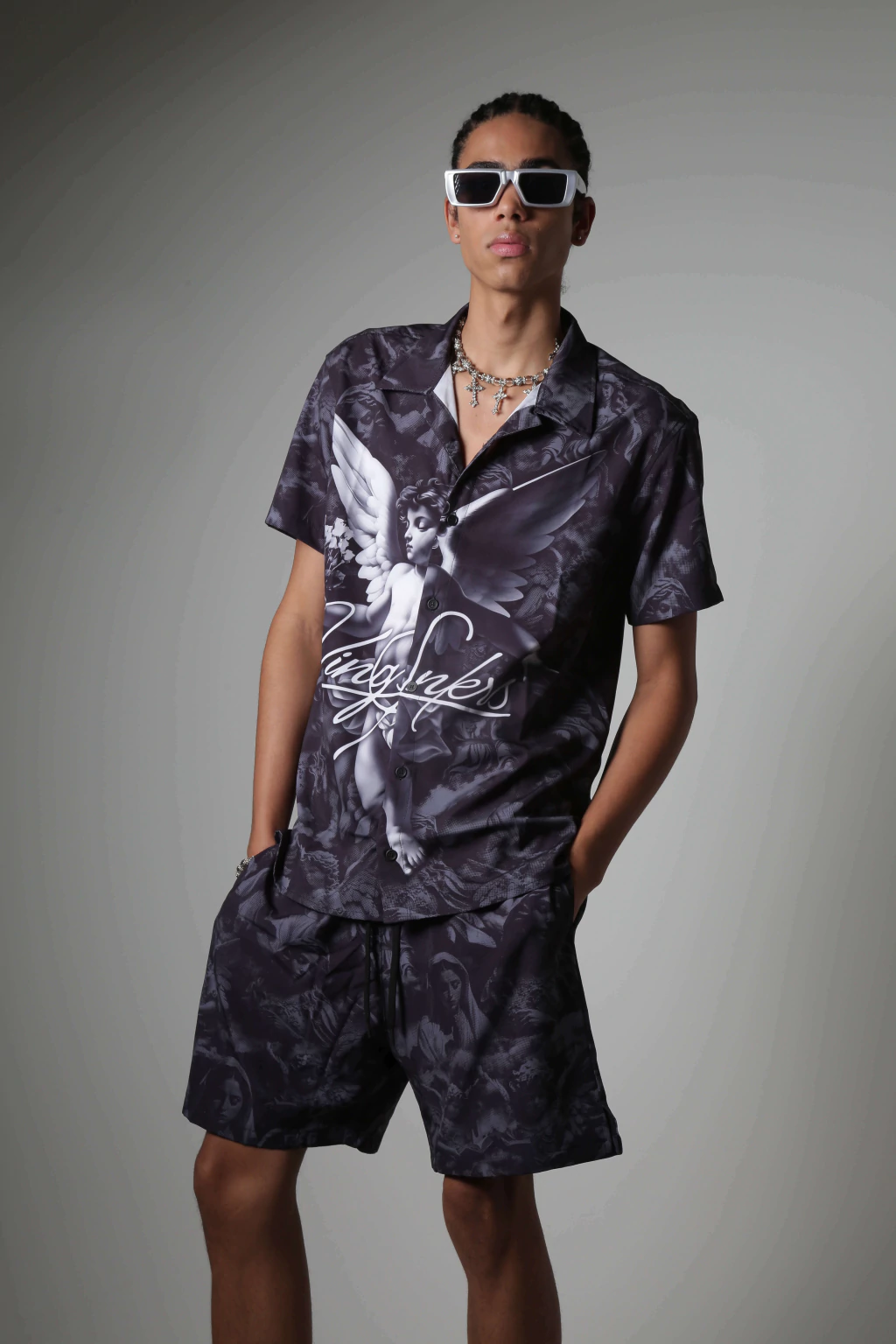 A Camisa Kings Amém Angel é a definição de estilo urbano com atitude. Em um tom cinza sofisticado, a peça se destaca pela sua padronagem exclusiva, composta por estampas de anjos e imagens por toda a camisa, criando uma identidade visual intensa e artística. O design ainda inclui um anjo grande na parte frontal e outro anjo imponente nas costas, reforçando a proposta da coleção Amém Angel. Com fechamento em botões, é uma camisa versátil e cheia de presença.
