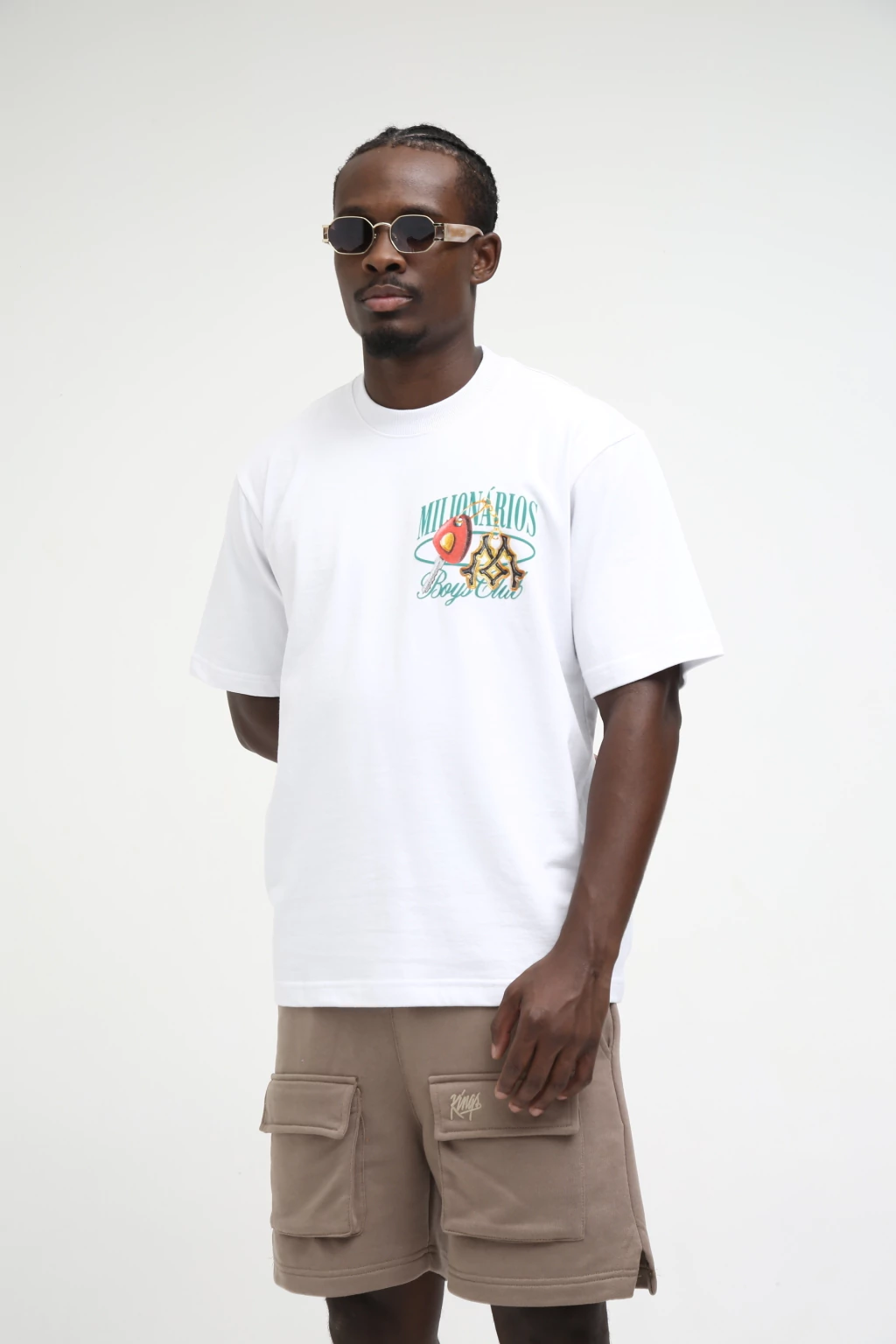 A Camiseta Milionarios Módena Branca é confeccionada em tecido de alta qualidade, trazendo estampa da marca Milionarios no peito e nas costas, acompanhada do slogan Boys Club, unindo estilo urbano e autenticidade.